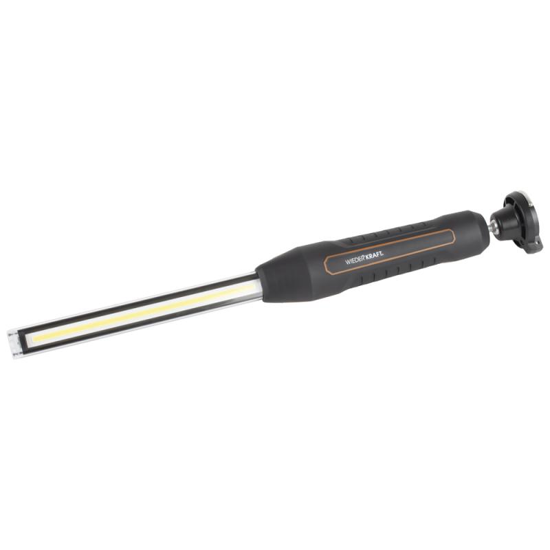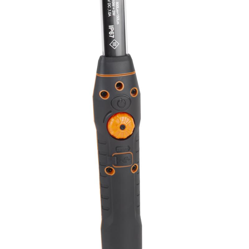 Светодиодный фонарь может использоваться при ремонтных и строительных работах. Магнитное крепление с шарниром и подвесной крюк обеспечивают возможность максимально удобной фиксации. Ударопрочный корпус с защитой от влаги и пыли IP67. Регулятор мощности светового потока от 80 до 800 Лм. Два режима работы, включая ультраяркий светодиод в верхней части светильника для труднодоступных мест. \n \nЗарядка осуществляется через разъем micro-USB. Кабель для зарядки в комплекте.