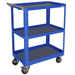 Размер 950х600х450мм. Комплект резиновых ковриков. Общая равномерно-распределённая нагрузка на тележку - до 100кг. Корпус выполнен из листовой стали толщиной от 0,6 до 1,5мм., покрыт полимерной порошковой краской. Верхняя и средняя полка имеют высоту борта 40мм., нижняя полка имеет высоту борта 60мм