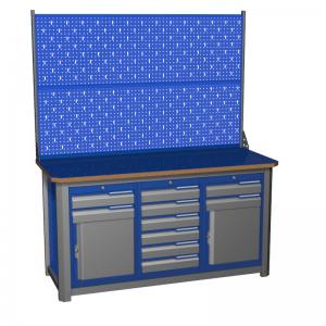 1970х1500х700 мм. со столешницей (фанера 24 мм. + 6 мм. сталь). Сборно-разборный каркас. Включает в себя: два модуля с дверцей и 2-я выдвижными ящиками, модуль с 6-ю выдвижными ящиками, экран, дополнительный экран.