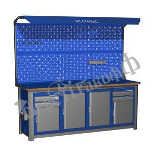 В изготовлении столешницы применяют лист фанеры 24 мм толщиной и стальной слой в 6 мм. Верстак не оснащен полками. Сверху экрана установлена подсветка на магнитных креплениях для легкого монтажа. Изделие имеет гарантию сроком на 1 год.