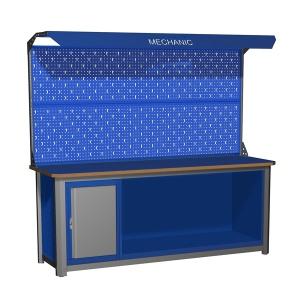 Верстак MECHANIC Э2С — удобная четырехтумбовая модель, которая идеально подойдет для мастерской, столярной или автосервиса. Три тумбы представляют собой открытые полки для хранения инструментов, одна тумба — это полка с дверью, в которую можно поместить документы и другие важные предметы. Предусмотрен экран и подсветка для удобства работы. Сверху экрана установлена подсветка на магнитных креплениях для легкого монтажа. Столешницы верстака отличается прочностью, изготавливается из двух слоев – 6-миллиметровой стали и 24-миллиметровой фанеры.