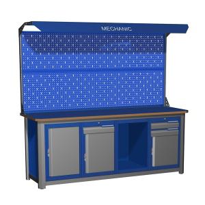 Предлагаемая модель верстака MECHANIC служит для слесарных и ремонтно-восстановительных работ, производимых в мастерских, гаражах, цехах заводов и учебных предприятий. Столешница верстака сделана из качественной фанеры толщиной 24 миллиметра с металлической обшивкой в 6 миллиметров Устойчивая рама с четырьмя опорами — стальная. Допустимая эксплуатационная нагрузка на изделие при равномерном распределении по поверхности не должна превышать 3000 килограмм. В конструкции верстака имеются четыре тумбы с тремя выдвижными ящиками и дверью, 2 выдвижными ящиками. Имеется экран и подсветка. Сверху экрана установлена подсветка на магнитных креплениях для легкого монтажа.
