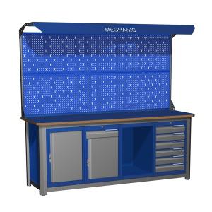 Верстак MECHANIC представляет собой оборудование, используемое для проведения различных слесарных и механических работ в мастерских, учебных цехах и на производстве. Верстак, имеющий надежную стальную раму с четырьмя опорами и столешницу из фанеры, толщиной 24 миллиметра и стальным шести миллиметровым покрытием, уверенно выдерживает нагрузку до 3000 килограмм.