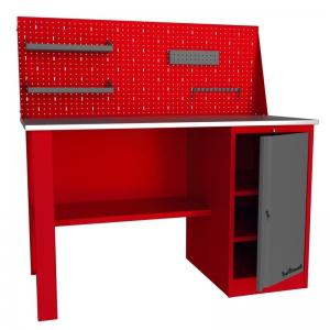 Верстак выполнен в красном цвете RAL 3000, ящики (или двери) в сером цвете RAL 7024. Для организации рабочих мест в автосервисах, мастерских, цехах и т.д., компания разработала линейку верстаков и рабочих столов. Основания этих изделий изготовлены из листового металла и покрыты порошковой краской. Столешницы сделаны из фанеры толщиной 24 мм. и обшиты оцинкованным металлом толщиной 1 мм.