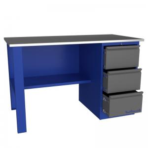 Универсальный верстак PRF-114 Д3 прекрасно дополнит мастерскую. Модель оснащена одной тумбой с тремя выдвижными ящиками, нижней полкой. В конструкцию встроен центральный замок. Стол имеет две вертикальные опоры, придающие ему прочность. Основные элементы верстака произведены из листового металла. На него нанесена порошковая краска, которая защищает изделие от коррозии.