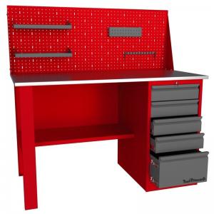 Верстак выполнен в красном цвете RAL 3000, ящики (или двери) в сером цвете RAL 7024. Для организации рабочих мест в автосервисах, мастерских, цехах и т.д., компания разработала линейку верстаков и рабочих столов. Основания этих изделий изготовлены из листового металла и покрыты порошковой краской. Столешницы сделаны из фанеры толщиной 24 мм. и обшиты оцинкованным металлом толщиной 1 мм.