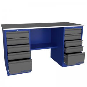 Верстак PRF-216 Д5 Д5 отлично подойдёт для работы в специализированных цехах, образовательных учреждениях и промышленных предприятиях. Его конструкция включает в себя две тумбы с пятью выдвижными ящиками, полку, а также вместительную столешницу. Слой металла с оцинкованной поверхностью нанесен на столешницу для усиления её прочности. Его толщина — 1 мм.