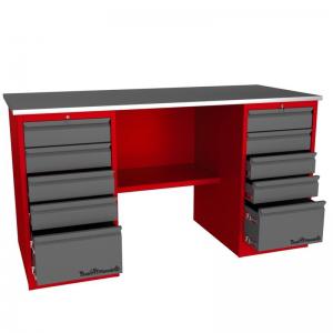 Верстак выполнен в красном цвете RAL 3000, ящики (или двери) в сером цвете RAL 7024. Для организации рабочих мест в автосервисах, мастерских, цехах и т.д., компания разработала линейку верстаков и рабочих столов. Основания этих изделий изготовлены из листового металла и покрыты порошковой краской. Столешницы сделаны из фанеры толщиной 24 мм. и обшиты оцинкованным металлом толщиной 1 мм.