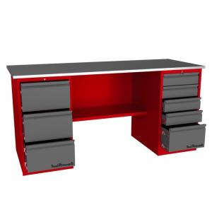 Верстак выполнен в красном цвете RAL 3000, ящики (или двери) в сером цвете RAL 7024. Для организации рабочих мест в автосервисах, мастерских, цехах и т.д., компания разработала линейку верстаков и рабочих столов. Основания этих изделий изготовлены из листового металла и покрыты порошковой краской. Столешницы сделаны из фанеры толщиной 24 мм. и обшиты оцинкованным металлом толщиной 1 мм.