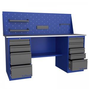 Cтолешница 1800 мм (фанера 24 мм + оцинкованный металл 1 мм), тумба с 4-я ящиками, тумба с 5-ю ящиками, полка-стенка. Вес - 118/130/143 кг. Объем - 0,62/0,65/0,68 куб. м. Кол-во мест 4/5. (ВхШхГ)1355х1800х700