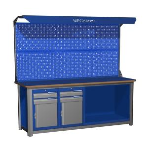 Верстак MECHANIC подходит для оснащения промышленных объектов и различных мастерски. Он оборудован четырьмя модулями. Первые два модуля имеют два выдвижных ящика и одну дверцу. В комплект оставшихся двух модулей входят полки. Верстак поставляется с защитным экраном и подсветкой. При желании заказчика изделие может быть дополнено комплектами крючков и всевозможными разновидностями держателей. Верстак имеет сборно-разборную конструкцию, которая значительно облегчает процесс его транспортировки. Сверху экрана установлена подсветка на магнитных креплениях для легкого монтажа.