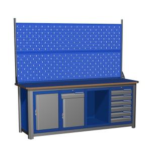 870х2000х700 мм. со столешницей (фанера 24 мм. + 6 мм. сталь). Сборно-разборный каркас. Включает в себя: модуль с дверцей, модуль с дверцей и одним выдвижным ящиком, полка-стенка большая, модуль с 6-ю выдвижными ящиками.