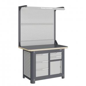Верстак серии MECHANIC: MCN 1252.S39-2F состоит из столешницы шириной 1193 мм, рамы верстака, состоящей из опор, перемычек, боковых перфопанелей, малого модуля S3, малого модуля S9, двойного экрана с кронштейнами и комплекта освещения.