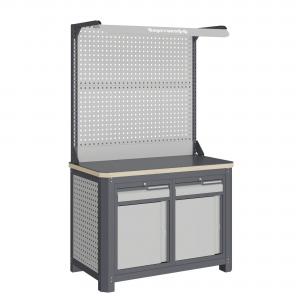 Рабочее место MECHANIC: MCN 1252.S88-2F состоит из столешницы шириной 1193 мм, рамы верстака, состоящей из опор, перемычек, боковых перфопанелей, двух небольших модулей S8 (один ящик и дверца), двойной экран с кронштейнами и комплектом освещения.