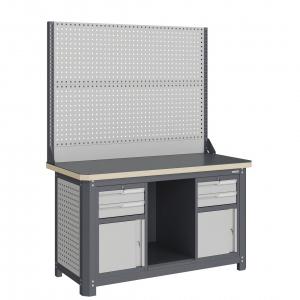 Верстак серии MECHANIC: MCN 1552.S99.1-2 состоит из столешницы шириной 1493 мм, рамы верстака, состоящей из опор, перемычек, боковых перфопанелей, двух малых модулей S9, комплекта полка-стенка SW1, двойного экрана с кронштейнами.