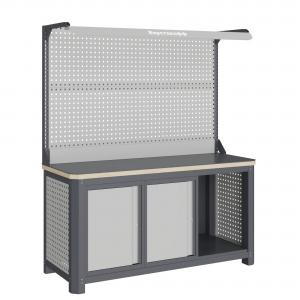 Верстак серии MECHANIC: MCN 1552.S77.1-2F состоит из столешницы шириной 1493 мм, рамы верстака, состоящей из опор, перемычек, боковых перфопанелей, малых модулей S7 и комплекта полка-стенка SW1, двойного экрана с кронштейнами с комплектом освещения.