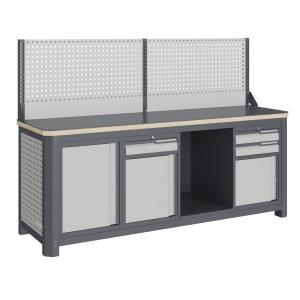 Верстак серии MECHANIC: MCN 2052.S789.1-1 состоит из столешницы шириной 1993 мм, рамы верстака, состоящей из опор, перемычек, боковых перфопанелей, малых модулей S7, S8, S9 и комплекта полка-стенка SW1, одинарного экрана с кронштейнами.