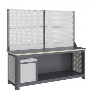 Верстак серии MECHANIC: MCN 2052.S8.111-2 состоит из столешницы шириной 1993 мм, рамы верстака, состоящей из опор, перемычек, боковых перфопанелей, малого модуля S8 и трех комплектов полка-стенка SW1, двойного экрана с кронштейнами.