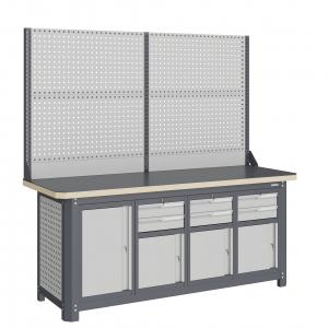 Верстак серии MECHANIC: MCN 2052.S7999-2 состоит из столешницы шириной 1993 мм, рамы верстака, состоящей из опор, перемычек, боковых перфопанелей, малых модулей S7 и S9, двойного экрана с кронштейнами.