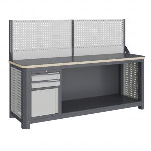 Верстак серии MECHANIC: MCN 2052.S9.111-1 состоит из столешницы шириной 1993 мм, рамы верстака, состоящей из опор, перемычек, боковых перфопанелей, малого модуля S9 и трех комплектов полка-стенка SW1, одинарного экрана с кронштейнами.