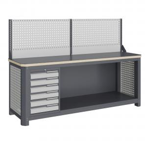 Верстак серии MECHANIC: MCN 2052.S6.111-1 состоит из столешницы шириной 1993 мм, рамы верстака, состоящей из опор, перемычек, боковых перфопанелей, малого модуля S6 и трех комплектов полка-стенка SW1, одинарного экрана с кронштейнами.