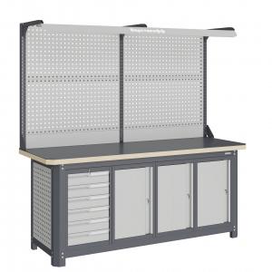 Верстак серии MECHANIC: MCN 2052.S6777-2F состоит из столешницы шириной 1993 мм, рамы верстака, состоящей из опор, перемычек, боковых перфопанелей, малых модулей S6 и S7, двойного экрана с кронштейнами и комплектом навесок.