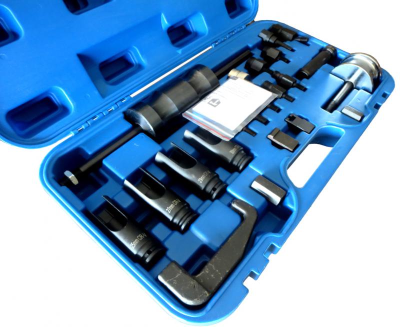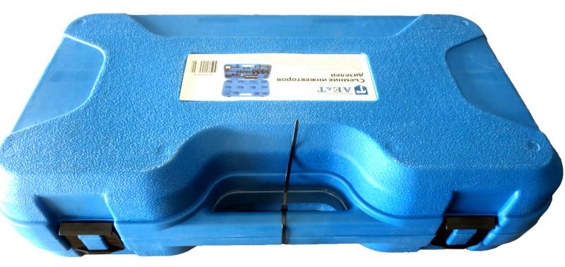 Съемник инжекторов дизелей TA-D1118-A можно использовать для демонтажа техники Bosch, Delphi, Denso, Siemens и Pumpe Duse. Большой комплект из ключей, обратных молотков и переходников позволяет работать, не повреждая агрегаты.