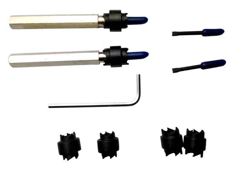 Сверла TA-F7511 – это набор, состоящий из четырех сверл (8 и 9,5 мм – по 2 шт), шестигранных хвостовиков ¼ дюйма, направляющих штифтов и ключа. Позволяет высверливать точки под сварку в элементах кузова любых машин.