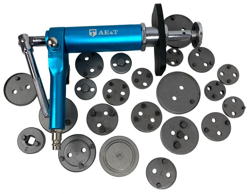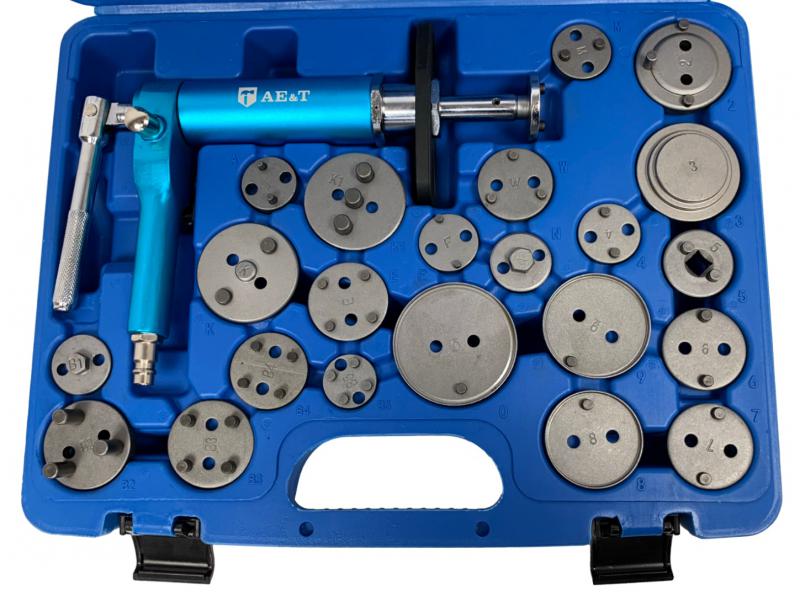 В составе набора инструмент с пневмоцилиндром для выталкивания шеек поршней и 20 адаптеров. Подойдет для суппортов с правосторонней и левосторонней резьбой.