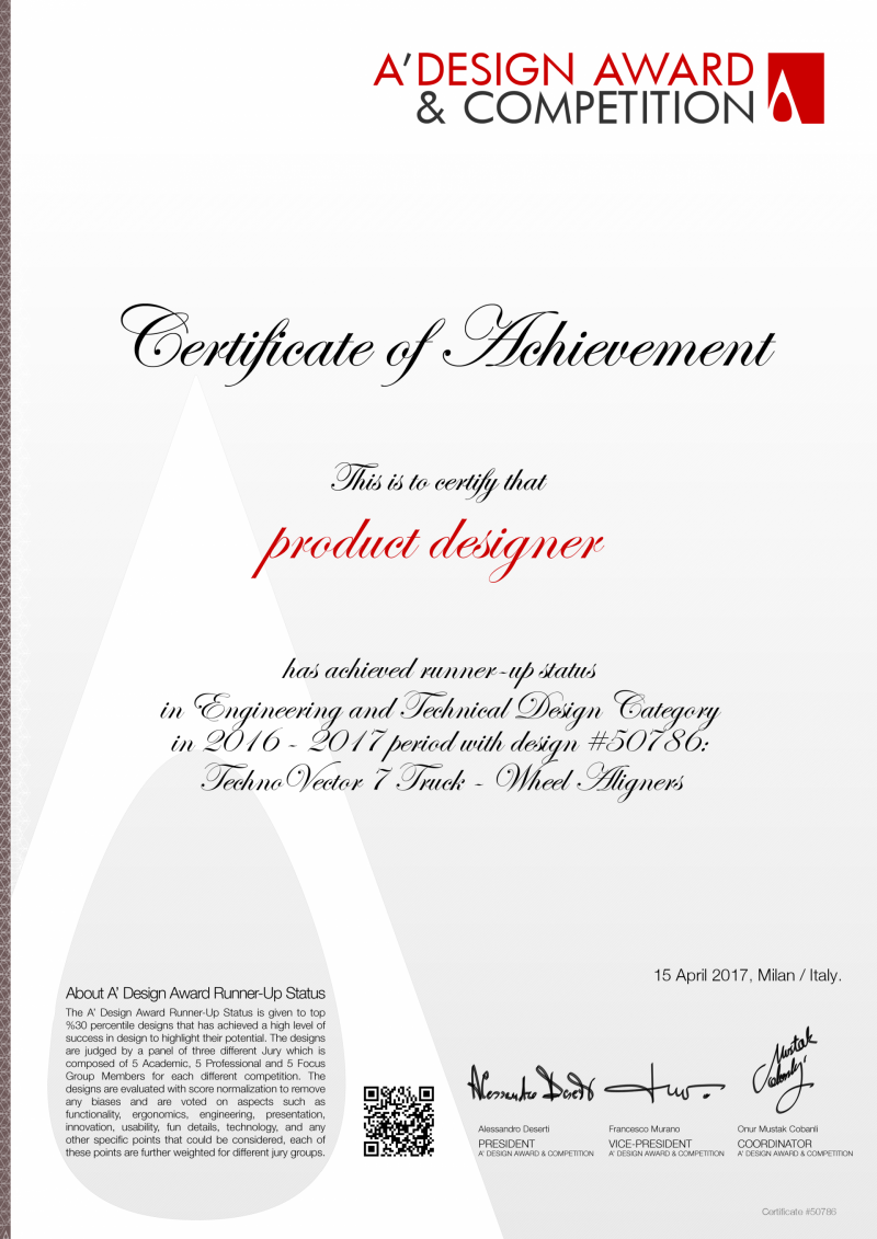 Техно Вектор 7 TRUCK — серебряный призер A Design Award!Стенд схода-развала Техно Вектор 7 TRUCK с 3D-технологией получил премию «A’ Design Award & Competition» 2016-17. Жюри отметило его в номинации «Инженерное и техническое проектирование», присудив серебряную награду. A Design Award — одна из самых престижных в мире премий в дизайнерской сфере. В конкурсе участвовали 1958 претендентов из 98 государств, всего рассматривалось 97 номинаций в разных дисциплинах дизайна. Премия A Design Award символизирует профессионализм, мастерство, новаторский подход к разработкам.