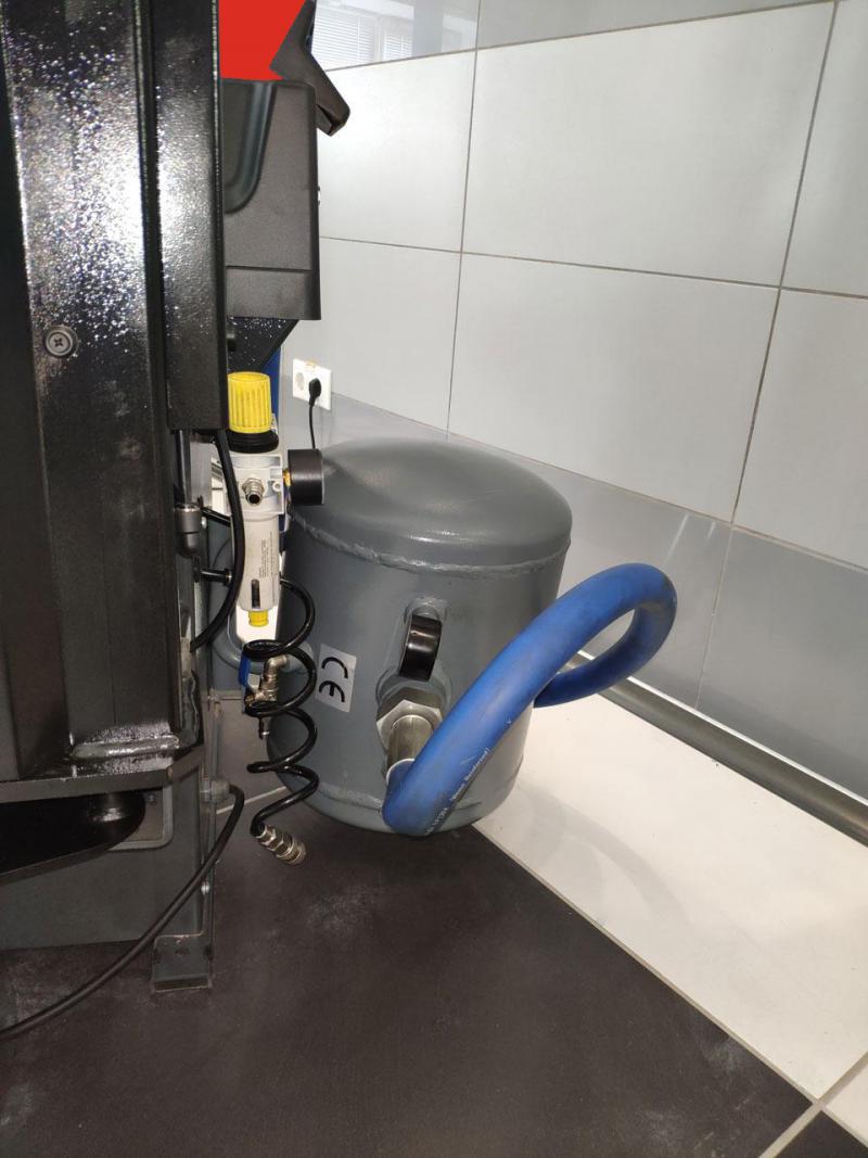 Манометр контроля давления воздуха смонтирован на монтажной стойке. Накачка нажатием ногой на педаль.