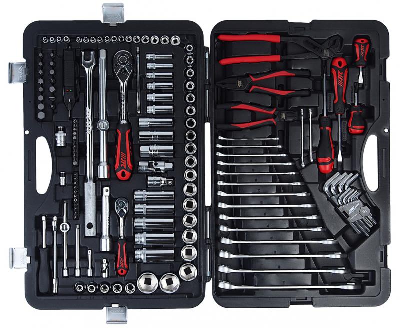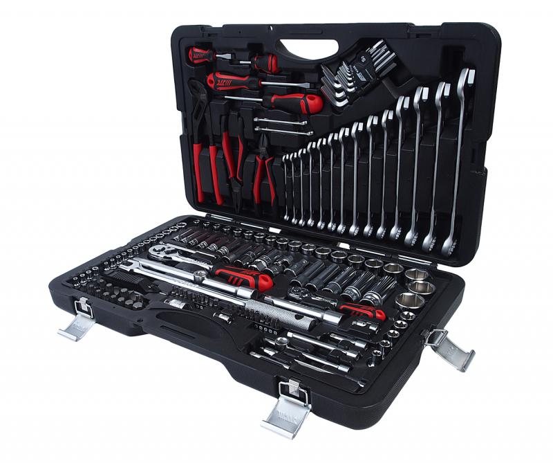 1/2: 19 шт. головки торцевые 6-гр. 1/2: 8, 9, 10, 11, 12, 13, 14, 15, 16, 17, 18, 19, 20, 21, 22, 24, 27, 30, 32 мм. 5 шт. головки торцевые глубокие 6-гр. 1/2: 13, 14, 17, 19, 22 мм. 5 шт. головки торцевые Е-профиль 1/2: E10, E12, E14, E16, E18. 1 шт. трещотка 1/2 72 зуба. 3 шт. удлинитель 1/2 50мм, 125мм, 250 мм. 1 шт. головка свечная 1/2 12-гр. 14 мм. 2 шт. головки свечные 1/2 6-гр. 16 мм., 21 мм. 1 шт. кардан универсальный 1/2. 1 шт. вороток шарнирный 381 мм. 1 шт. удлинитель переходник 1/2(M)-3/8(F). 1 шт. адаптер переходник 1/2 - 5/16. 15 шт. биты 5/16 (S2): 1 шт. бита PHILLIPS: PH4 2 шт. бита шлиц SLOTTED: 8, 10MM 4 шт. бита HEX: 8,10,12,14мм 4 шт. бита: T40, T45, T50, T55 4 шт. бита TRIPLE SQUARE: M6, M8, M10, M12 16 шт. ключи комбинированные: 6, 7, 8, 9, 10, 11, 12, 13, 14, 15, 16, 17, 19, 21, 22, 24 мм. 11 шт. ключи шестигранные Г-образные: 1.5, 2, 2.5, 3, 4, 5, 6, 7, 8, 9, 10 мм. 4 шт. отвертки: 2 шт. отвертки крест: PH2x38L, PH2x100L 2 шт. отвертки шлиц: 6ммx38L, 6ммx100L 1 шт. бокорезы диагональные 150 мм. 1 шт. плоскогубцы комбинированные 180 мм 1 шт. переставные клещи 250мм 1 шт. магнит телескопический 1 шт. индикатор напряжения 3-48V Упаковка: прочный переносной кейс. Габаритные размеры: 580/390/110 мм. (Д/Ш/В) Вес: 12500 гр.