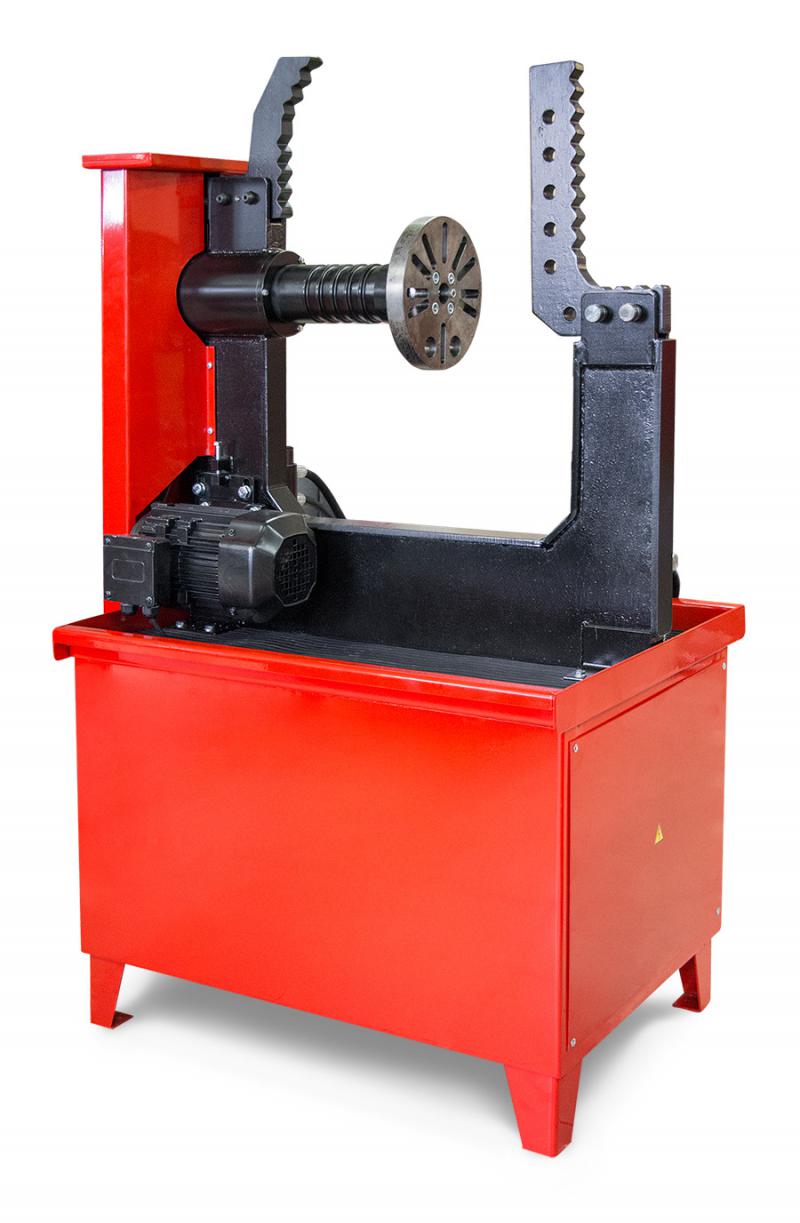 На обратной стороне струбцины расположен указатель биения, представляющий собой металлический стержень с острым основанием. Указатель биения служит для четкого определения места ремонта, особенно в заключительной стадии. Включение вращения шпинделя станка осуществляется нажатием кнопки, расположенной на передней панели. Передача момента от двигателя к шпинделю производится посредством ременной передачи.