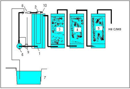 Сущность процесса заключается в последовательном выделении нефтепродуктов, находящихся в различной дисперсной фазе из сточных вод. Загрязненные сточные воды собираются в приямке (отстойнике). Здесь происходит отстаивание крупных взвешенных частиц и нефтепродуктов. Загрязненная вода подается струйным насосом в флотационную емкость 1. Происходит выделение дисперсных нефтепродуктов. После аппарата напорной флотации вода подается в установленные последовательно механические фильтры 3 и 4. Доочистка сточных вод до ПДК осуществляется на сорбционных фильтрах 5 заполненных активированным углем, сульфоуглем или другими природными или синтетическими материалами.