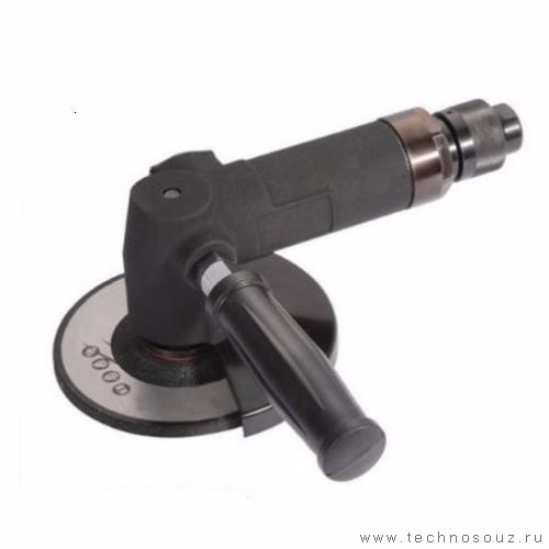 Пневмоболгарка снабжена защитным металлическим кожухом для предотвращения травм персонала во время работы.