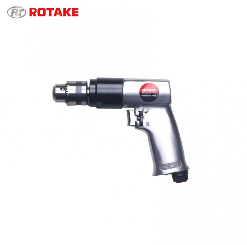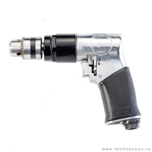 Пневматическая дрель изготовлена из алюминиевого сплава и стали. Механизм вращения – планетарный редуктор с высоким крутящим моментом. Функция реверса предназначена для освобождения заклинившего сверла. Отвод воздуха через ручку дрели, предотвращает завихрение пыли в зоне сверления. Фиксация сверла в патроне производится с помощью ключа.