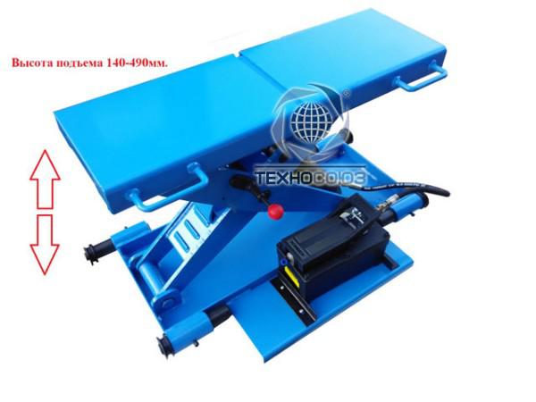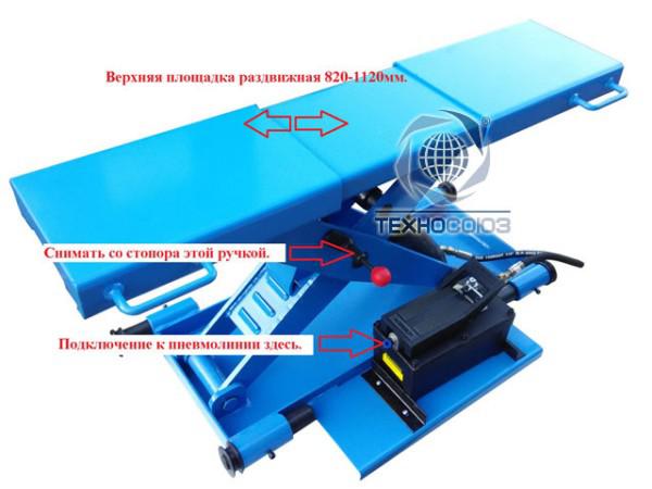 Для ямы шириной 820-920 мм. На канаву (яму) или четырехстоечный подъемник. Ширина регулируется 820-1120мм. Пневмогидравлический (подключение к компрессору). Г/П 2,5т. Высота подъема без проставок 490мм.