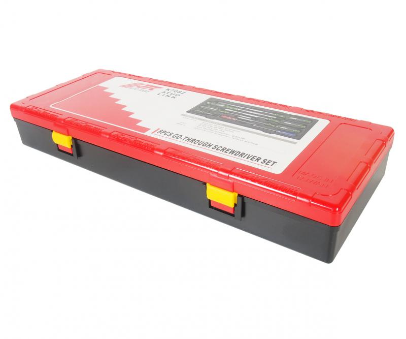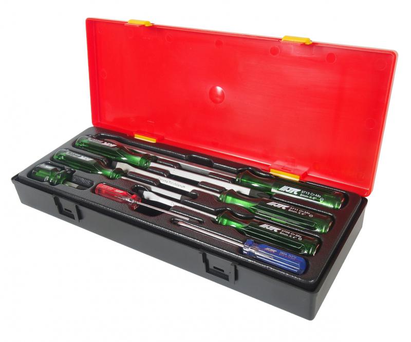 В комплекте: JTC-3708-3713: отвертки со сквозным стержнем: минус 6x100 мм., 8x150 мм, 8x200 мм., плюс #2x100 мм., #3x150 мм. - всего 5 шт. JTC-3707: отвертка с двухсторонней насадкой: плюс #2x38 мм. - 1 шт. JTC-3804-5: отвертки с одноцветной рукояткой: минус 3x75 мм, плюс #0x75 мм. - 2 шт.