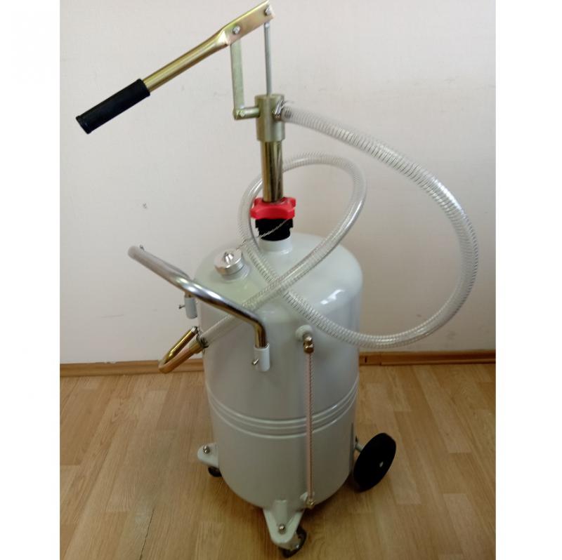 Нагнетатель масла, емкость 65 л. с индикатором уровня масла и пистолетом (ручной привод). Длина шланга 1,5 м, габариты: 1100x600x600 мм, вес: 21 кг