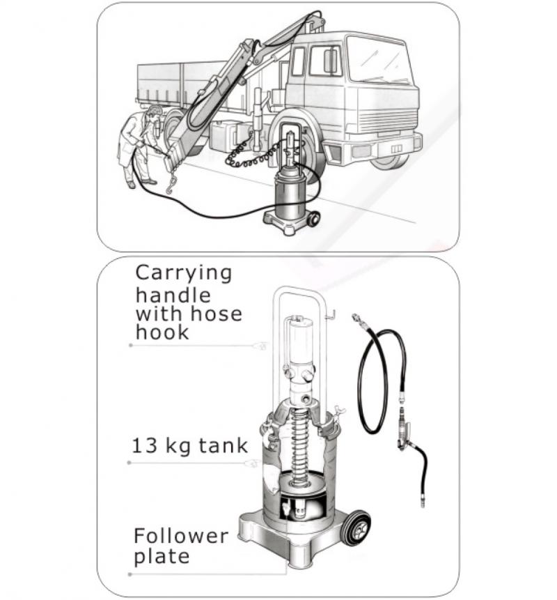 Дает давление еще больше и так до максимально возможной мощности компрессора. Потом насос ломается. Не допускайте попадания инородных предметов (песок, грязь, стружка и т.п.) внутрь нагнетателя. Используйте в нагнетателе только новую смазку. Отработку использовать нельзя. Регулируйте давление в пневмолинии в соответствии с консистенцией (густотой) смазки.