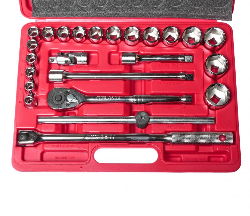 В комплекте: 18 ед. головка 1/2: 10, 11, 12, 13, 14, 15, 16, 17, 18, 19, 21, 22, 23, 24, 27, 29, 30, 32 мм. 2 ед. удлинитель 1/2: 5, 10. 1 ед. вороток с шарниром 1/2. 1 ед. вороток с плавающей головкой 1/2. 1 ед. трещотка 1/2. 1 ед. карданный переходник 1/2. Упаковка: прочный переносной кейс. Габаритные размеры: 380/300/90 мм. (Д/Ш/В) Вес: 5300 гр.