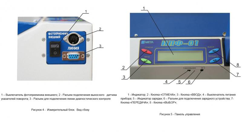 Прибор света фар ИПФ позволяет контролировать светораспределение. Измерение характеристик световых приборов: сила света фар и фонарей, частота следования проблесков, время задержки. Автоматическая передача протокола измерений в центральную ПЭВМ линии технического контроля. Ввод Номера регистрации АТС с панели и передача протокола измерений.