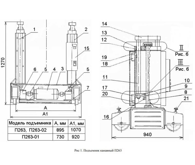 Подъемник состоит двух стоек 1 и 2 (см. Рис.), соединенных между собой поперечиной 3, в которой смонтирован привод подъема. Привод состоит из электродвигателя 4, соединенного при помощи двух муфт 5 с редукторами 6, установленными на раме 7. Стойки 1 и 2 представляют собой сварную конструкцию. Внутри стоек смонтированы грузовые винты 8 по которым перемешаются рабочие гайки 9. Гайки установлены в траверсах 10. На траверсах закреплены штанги 11, проходящие через направляющие втулки 12, закрепленные в опорах 13. В верхней части штанг закреплены башмаки 14. Передача вращения к грузовым винтам осуществляется посредством муфт 5. На винтах, под рабочими гайками с зазором 10-12 мм, смонтированы страховочные гайки 16. Ход гаек по винту ограничен двумя конечными выключателями 17 и 18, смонтированными на одной из стоек. На случай отказа конечных выключателей 17 и 18 предусмотрены аварийные выключатели 19 и 20. Подъемник снабжен тормозами 21, расположенными на опорах. Управление подъемником осуществляется со шкафа аппаратного 15, установленного на стойке 2