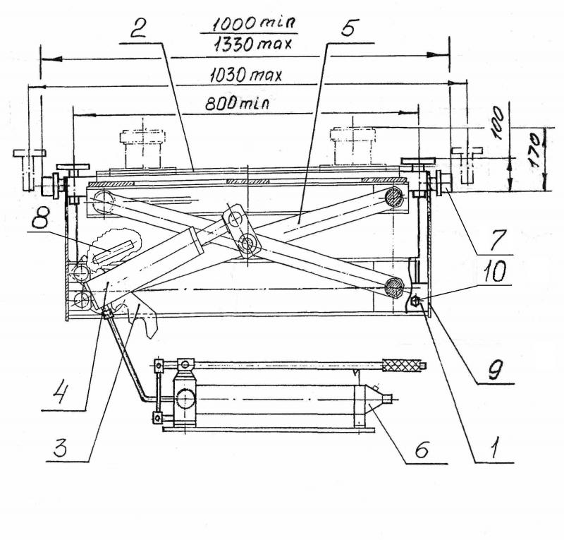 Подъемник ПНК-1 ( см. Рис.1) состоит из рамы 1, перемещающейся по направляющим канавы на подпружиненных роликах 7, корпуса 2, фиксатора 3, гидроцилиндра 4, системы рычагов 5 и насоса ручного гидравлического 6. Неподвижность подъемника в канаве, в рабочем положении, обеспечивается за счёт деформации пружин роликов 7 под весом поднимаемого автомобиля. Подъем корпуса 2 с установленными на нем опорами для подъема автомобиля, осуществляется за счёт выдвижения штока гидроцилиндра 4. Подача масла в поршневую полость гидроцилиндра осуществляется с помощью ручного гидравлического насоса 6. Фиксация корпуса в поднятом положении производится с помощью фиксатора 3. Для освобождения фиксатора при опускании корпуса предназначена рукоятка 8
