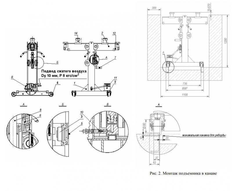 г/п 10 тонн. Универсальный. Рельсовый. Пневмопривод. Для канавы шириной 700-1100 мм и подъёма легковых и грузовых автомобилей. Многоуровневая система безопасности. Регулируемые упоры, позволяющие поднимать автомобили с различной конфигурацией рамы.