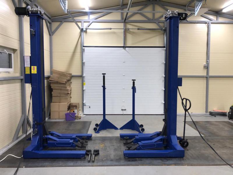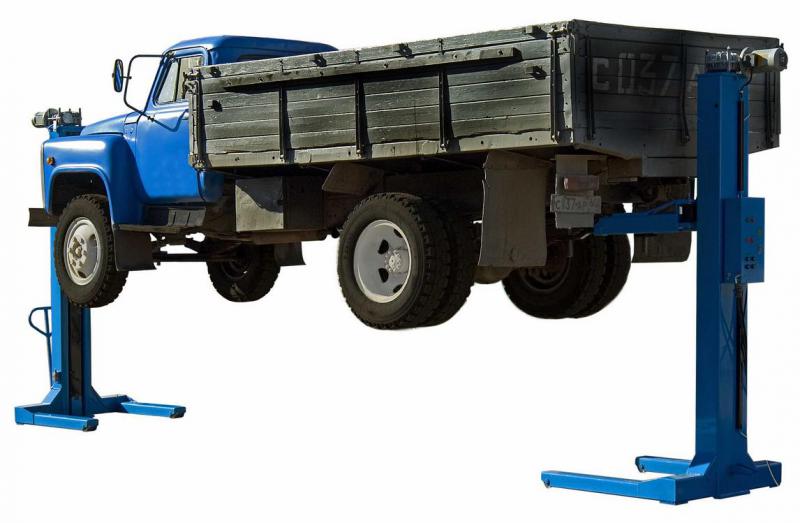 Комплектуется страховочными стойками и комплектом подхватов для подъёма грузовых рамных автомобилей, а также легковых автомобилей.