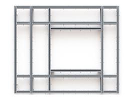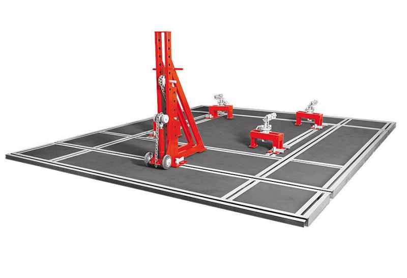 Основа кузовного стенда - модульная рама, которая собирается с помощью крепежных деталей и монтируется в подготовленный приямок заподлицо с полом. Модульная система позволяет легко собирать один или несколько постов необходимых размеров.
