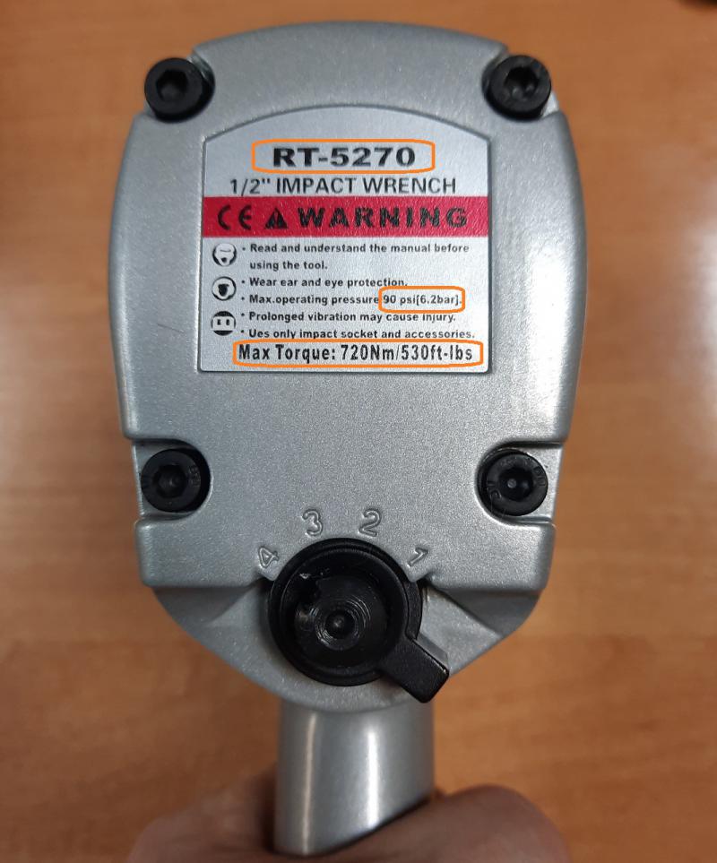 ТХ (таблица) (Описание) : Максимальное усилие для шпильки М19 -720 Нм, Размер посадочный под головку - 1/2”, Ударный механизм – Twin Hammer (двойной молоток), Встроенный реверсивный механизм, Регулировка момента затяжки – 4 положения. Скорость свободного вращения - 7 000 об/мин Расход воздуха - 226 (л/мин) Подключение - 1/4" Рабочее давление, (бар) 6.2 Уровень шума, (дБА) 86 Вес, (кг) 2,72