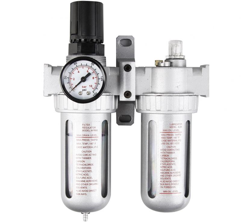 Контроль выходного давления – визуально по стрелке манометра. Влагоотделитель предназначен для автоматического удаления воды из пневмосистемы. Влагоотделитель предотвращает развитие коррозии внутри корпуса пневмоинструмента и как следствие значительное увеличение его срока службы. Лубрикатор, входящий в комплект поставки необходим для подачи жидкой смазки непосредственно в корпус пневмоинструмента. Смазка пневмоинструмента с помощью лубрикатора кратно увеличит срок службы!!! Только не забывайте добавлять смазку в стакан лубрикатора!!!