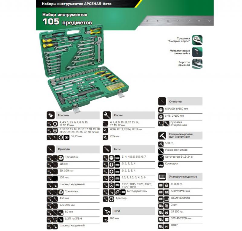 Набор инструментов 105 предметов AUTO Арсенал AA-C1412P105 пригодится не только для работы дома, но и профессионалам, тем, кто занимается ремонтом и обслуживанием авто. Большой выбор комбинированных и разрезных ключей, отверток, также есть срывной вороток на 430 мм, всё это позволяет выполнять самые серьезные задачи. Сталь, из которой изготовлен инструмент, легирована хромом и ванадием с нанесением никелевого покрытия. Крепкий кейс из ударопрочной пластмассы. Наборы инструментов Арсенал имеют пожизненную гарантию. Инструмент Арсенал - Специально разработан для Российских условий!!!